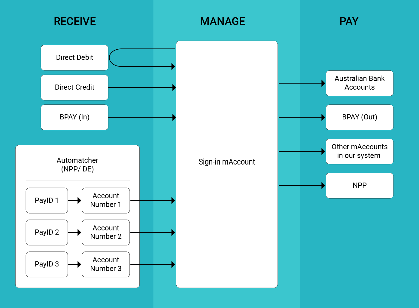 All funds paid to Automatcher account numbers will clear in your Sign-in mAccount. We provide you with full reporting so you will know exactly how much was paid to which account number. Importantly, we also support the creation of PayIDs to be associated with the Automatcher account number.